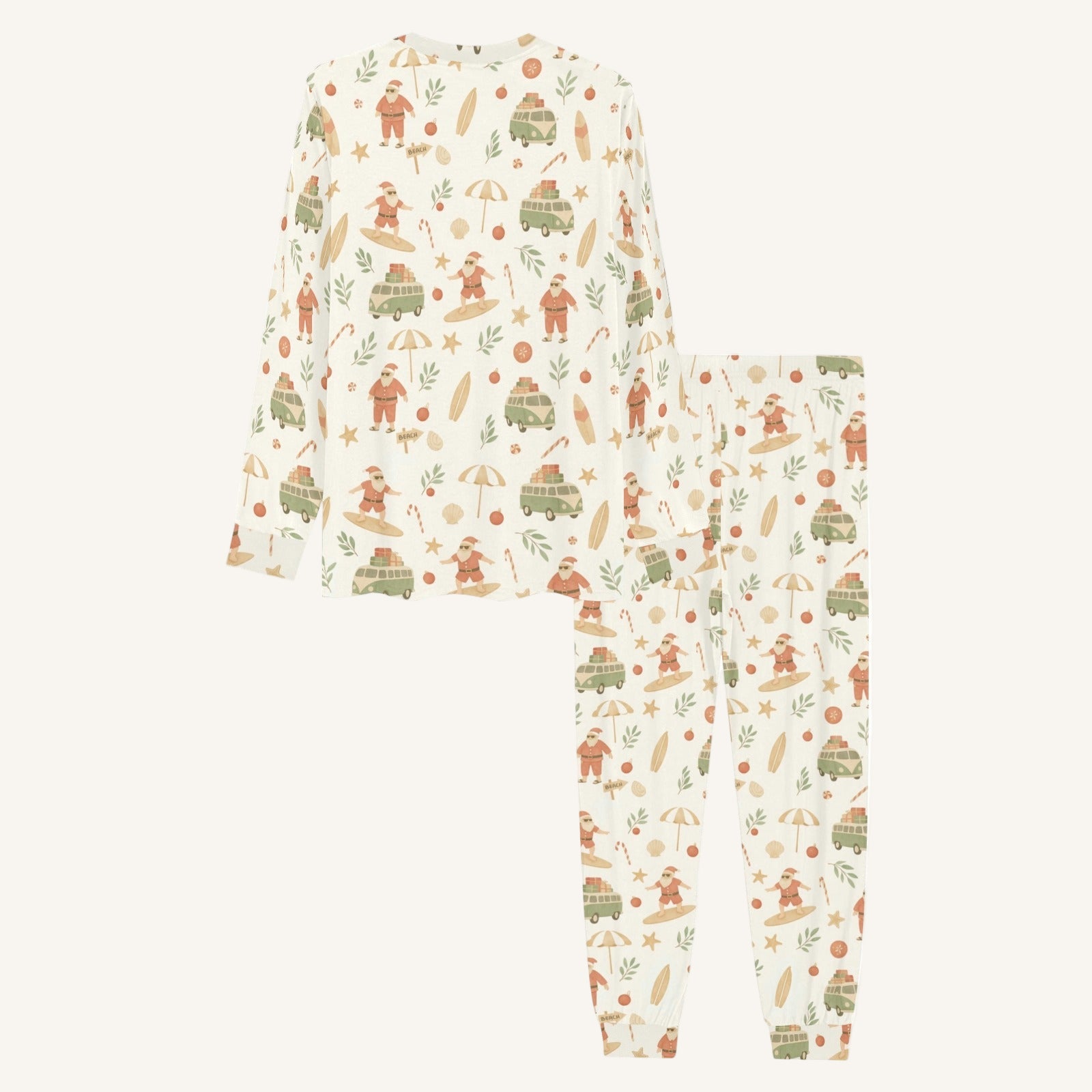 All-Over Print: Features our Surfing Santas pattern — Kombi vans stacked with gifts, beachy treasures, and jolly Santas catching waves.